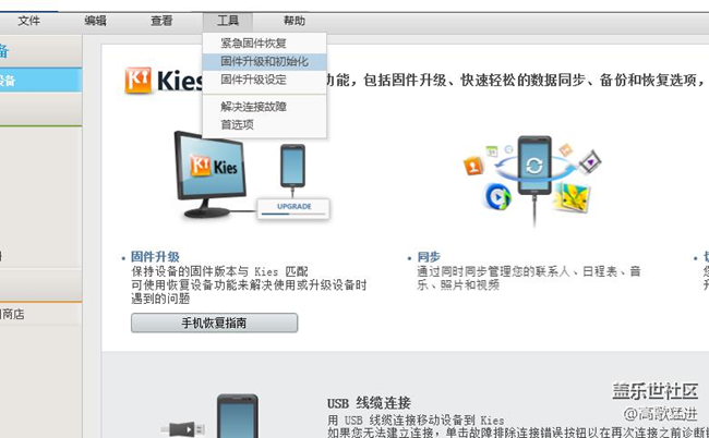 點(diǎn)擊工具下面的固件升級(jí)和初始化,然后輸入手機(jī)型號(hào),imei號(hào)什么的,然后拔線,進(jìn)入恢復(fù)模式(好像是home+音量減+開機(jī)鍵,然后再按音量加,具體怎么進(jìn)去軟件上有提示)進(jìn)去后再插線,然后就是漫長(zhǎng)的等待,(基本上一分鐘跑1%)我從十一點(diǎn)半一直到三點(diǎn)左右才弄好,弄完后,*你剛買回來的狀態(tài)一樣,照片什么的全部沒有了,提前做好備份。