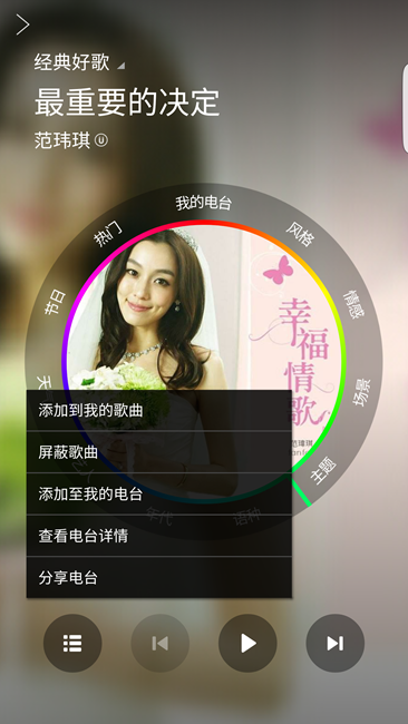 通過播放頁面的“更多”鍵,我們可以往“我的電臺”、“我的歌曲”中添加或移除,也可以查看電臺的詳情,還可以通過社交媒體分享電臺。