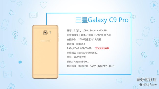 配置方面C9 Pro正面配備一塊6英寸1080p顯示屏,采用Super AMOLED材質(zhì);配備前后1600萬像素攝像頭,配備f1.9大光圈;采用驍龍653八核64位處理器,配備6G內(nèi)存+64GB機身存儲,支持雙卡雙待全網(wǎng)通的同時還支持MicroSD存儲卡拓展,最大支持256GB;采用4000mAh大容量電池,搭載Android6.0.1系統(tǒng),支持指紋識別、samsung pay以及hifi等功能。