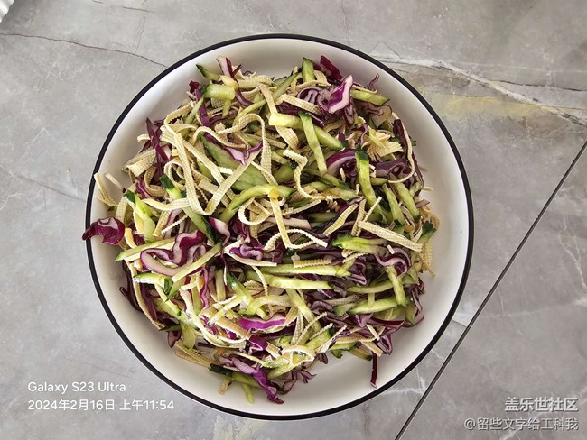 主要材料:一根長條黃瓜,一片薄千張,一塊新鮮紫甘藍(lán),一頭蒜,一份植物油。
