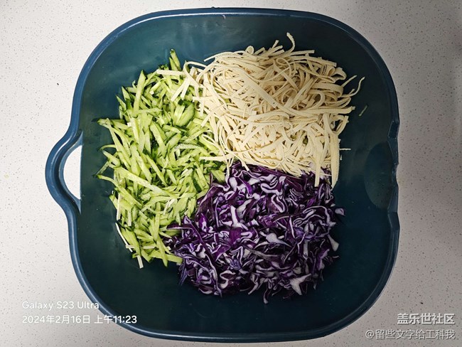 步驟2:將切好的黃瓜絲,千張條,紫甘藍(lán)條放到一個(gè)盆子里,同時(shí)將準(zhǔn)備好的蒜和植物油進(jìn)行加熱油炸,形成蒜香熟油。