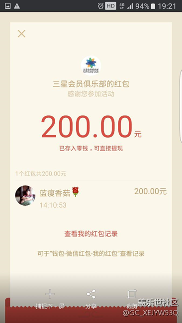 剛剛領(lǐng)到換了note7的紅包200塊錢(qián),還400,有誰(shuí)領(lǐng)到了? 圖片