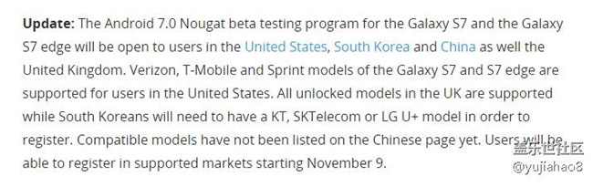翻譯:更新:S7和S7 edge的Android 7.0牛軋?zhí)堑腷eta測試計劃將開放在用戶美國韓國中國以及英國。S7和S7 edge的Verizon,T-Mobile和Sprint的機型都支持在美國的用戶。在英國,所有的解鎖模式都支持,而韓國人則需要有KT,SK電訊和LG U +模式,以注冊。兼容型號尚未上市的中國頁面上呢。用戶將能夠在支持市場注冊從11月9日開始。
