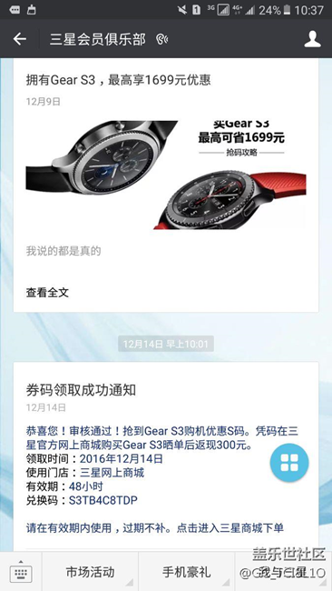 今天一早非常幸運(yùn),第一時(shí)間搶碼成功。經(jīng)過(guò)半天的抉擇,最終下定決心購(gòu)買Gear3,由于沒(méi)有先鋒版,對(duì)比一下覺(jué)得經(jīng)典版也非常適合,所以迅速下單,避免出現(xiàn)缺貨的尷尬局面,坐等Gear,嘿嘿!現(xiàn)在上圖,向大家分享一下。
