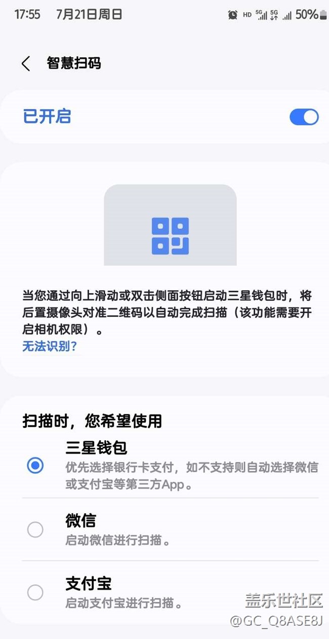 今天突然發(fā)現(xiàn)了一個新功能,試了一下跟華為那個有丟丟類似。把后置攝像頭對準支付碼,調用支付寶、微信掃碼支付。但是要先打開三星錢包,這就有點美中不足了!希望后面三星官方抓緊解決吧,還有這個反應速度也稍微有點慢。