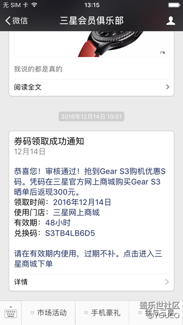 活動是12月12日開始的,連搶了兩天都木有搶到!于是在官微上留言“根本是騙人的嘛!”后來客服MM回復(fù)正確的搶碼時間每天上午10點點擊我要S碼;或許我太早了?還是在刷新的過程中被人先下手為強(qiáng)?終于功夫不負(fù)有心人,在12月14日搶到了“S碼”。