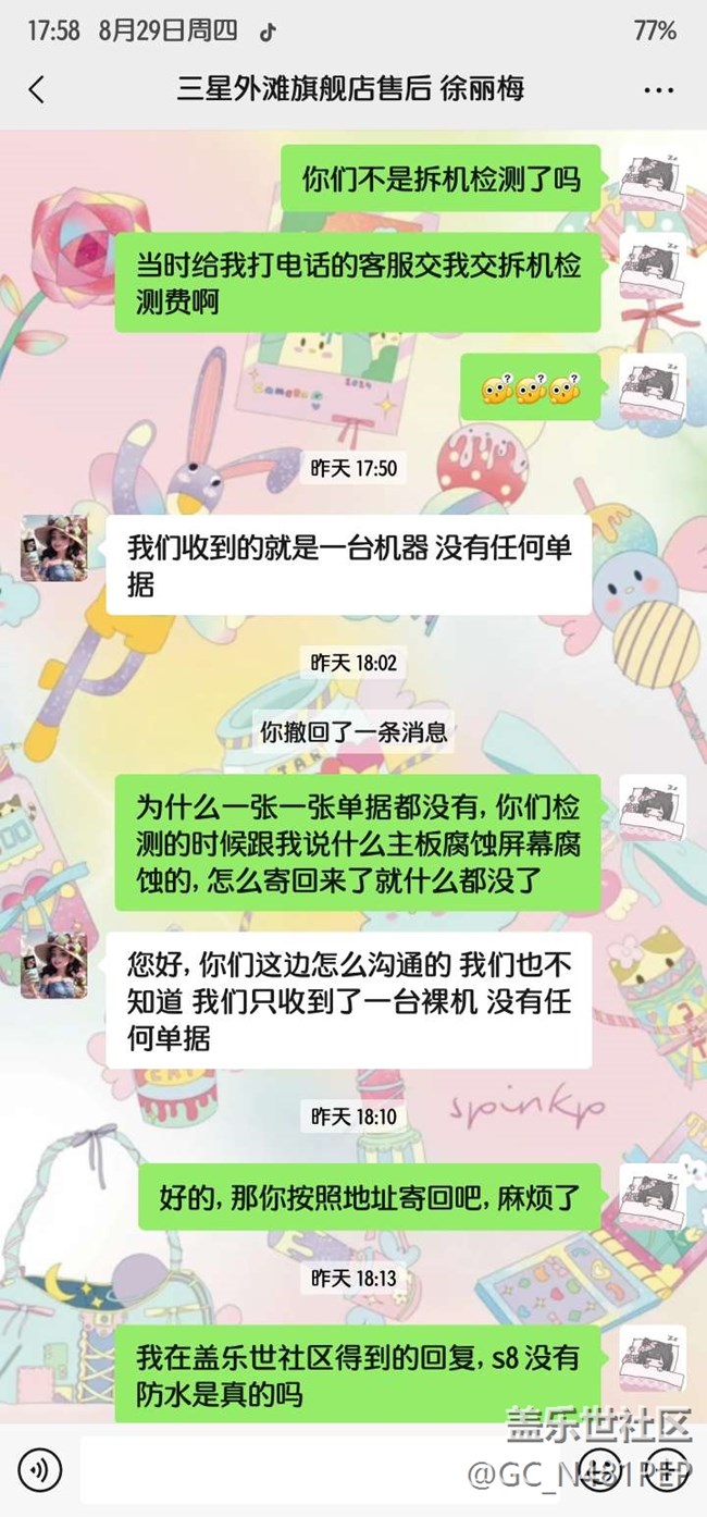 在我不小心淋雨不到三分鐘立馬反應(yīng)回家后, 平板出現(xiàn)不顯示不開機(jī)的異常情況。我先去了三星售后的外灘店,工程師解釋說機(jī)子是ip68防水級別,可以幫我寄修。我寄去售后, 售后拒絕了我的保修請求, 我還在保修 范圍內(nèi)的機(jī)子, 被客服拿去反饋, 反饋拖了好幾天, 然后現(xiàn)在機(jī)子不在質(zhì)保日期內(nèi)了,寄回還給我寄了到付, 真好意思。