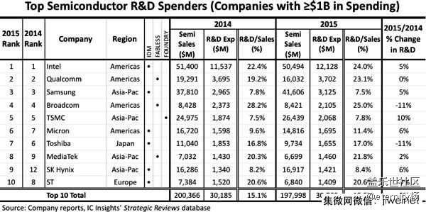 全球研發(fā)支出前十大IC廠商的支出金額總和在2015年增加了2%,而且該總和數(shù)字比其余半導(dǎo)體廠商的研發(fā)支出金額總和還要高(約308億美元:256億美元);這種趨勢是自2005年以來就維持至今。
