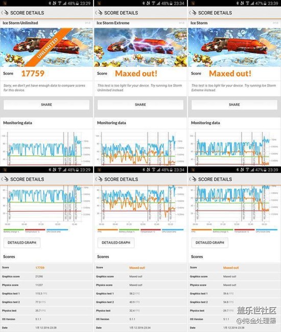 顯卡測(cè)試使用了3DMark,ice strom unlimited得分高達(dá)17759,另外兩個(gè)場(chǎng)景都已經(jīng)超過了最大成績無法計(jì)算,這就是傳說中的“爆表”嗎?