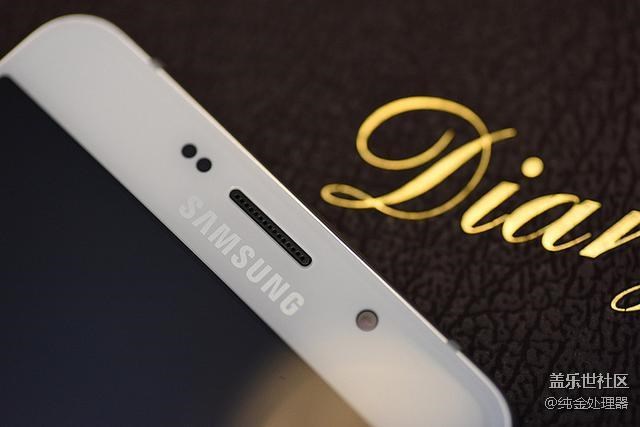 正面上段設(shè)計(jì)有感應(yīng)器、揚(yáng)聲器和前置攝像頭,三星LOGO在揚(yáng)聲器下面。