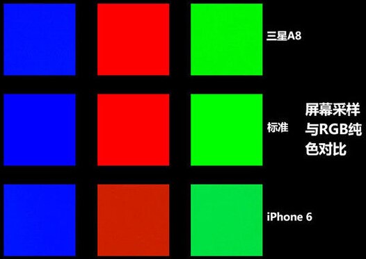 從純色對比圖中,我們可以看到A8的屏幕色彩還原得比較準(zhǔn)確,相比起iPhone 6的LCD而言,A8的Super AMOLED顯色尤其鮮艷。