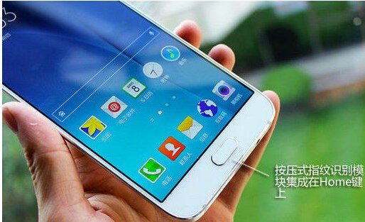全金屬邊框的設(shè)計配合上高光磚石倒角,在陽光的反射下金屬質(zhì)感尤其明顯,而右邊機(jī)身僅有一個電源按鍵,按鍵也采用了倒角設(shè)計,表面的磨砂質(zhì)感處理也恰到好處。而從另一邊的機(jī)身我們可以看到A8的側(cè)面采用了斜面倒角設(shè)計(這與S6的弧面中間凹陷不同),即使5.7英寸屏幕的機(jī)身也擁有較為良好的握持感受。