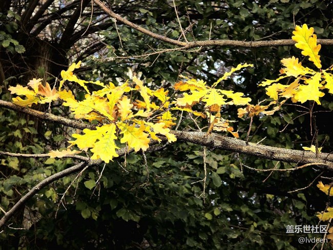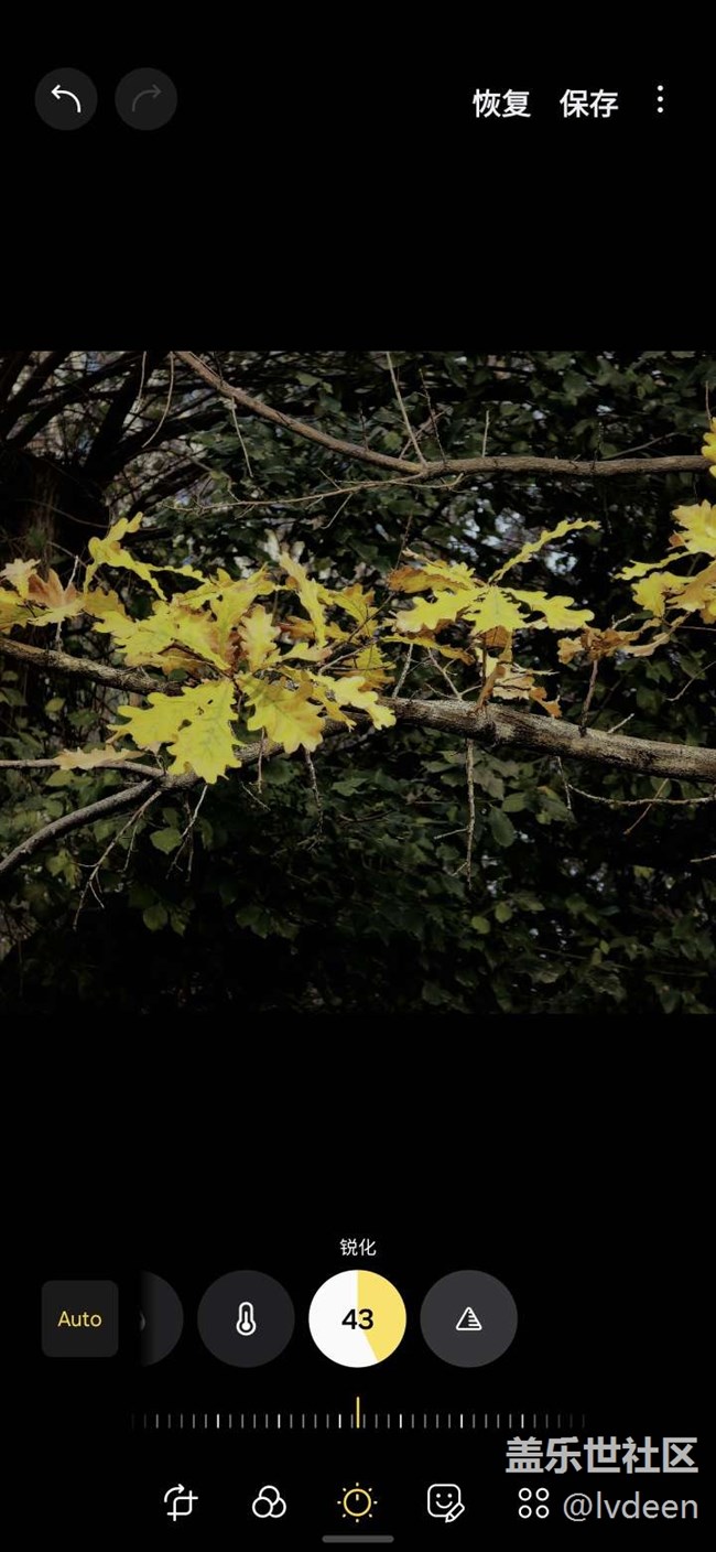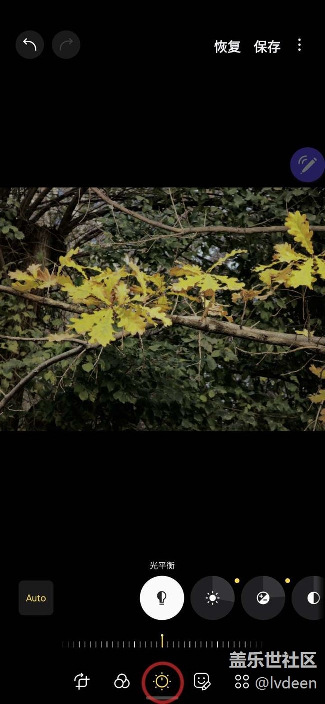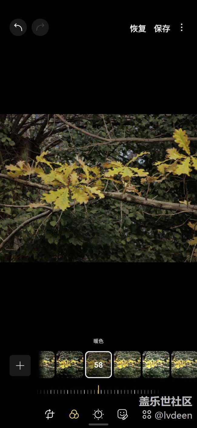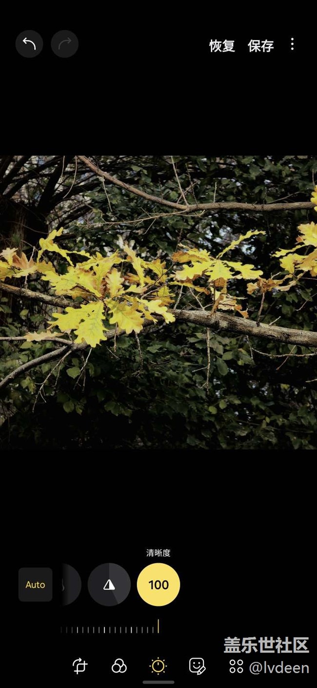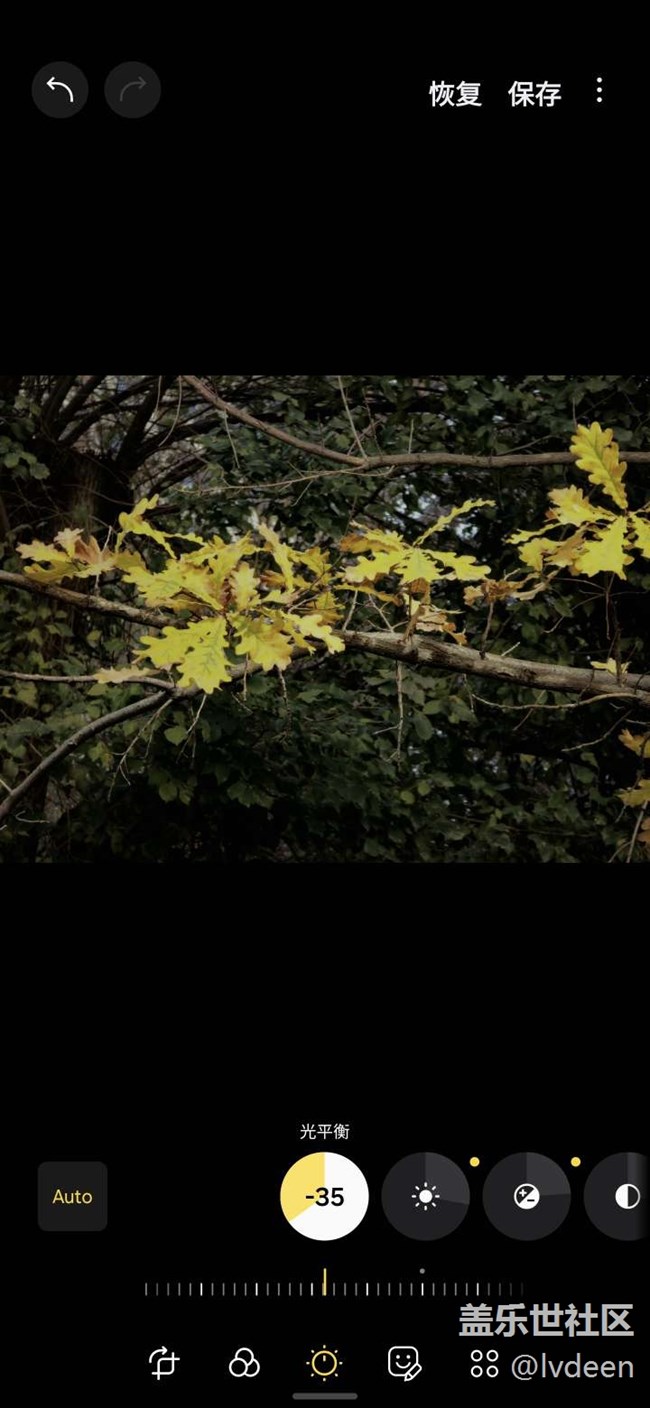 我想突出橡樹金黃的葉子,就讓光平衡往負數(shù)調(diào)整,周圍綠葉亮度降低。
