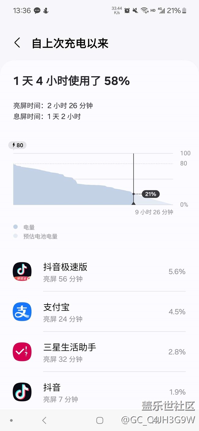 1天4小時,用了58%的電量,感覺還是不錯的,雖然亮屏不多,不過可以一天一沖