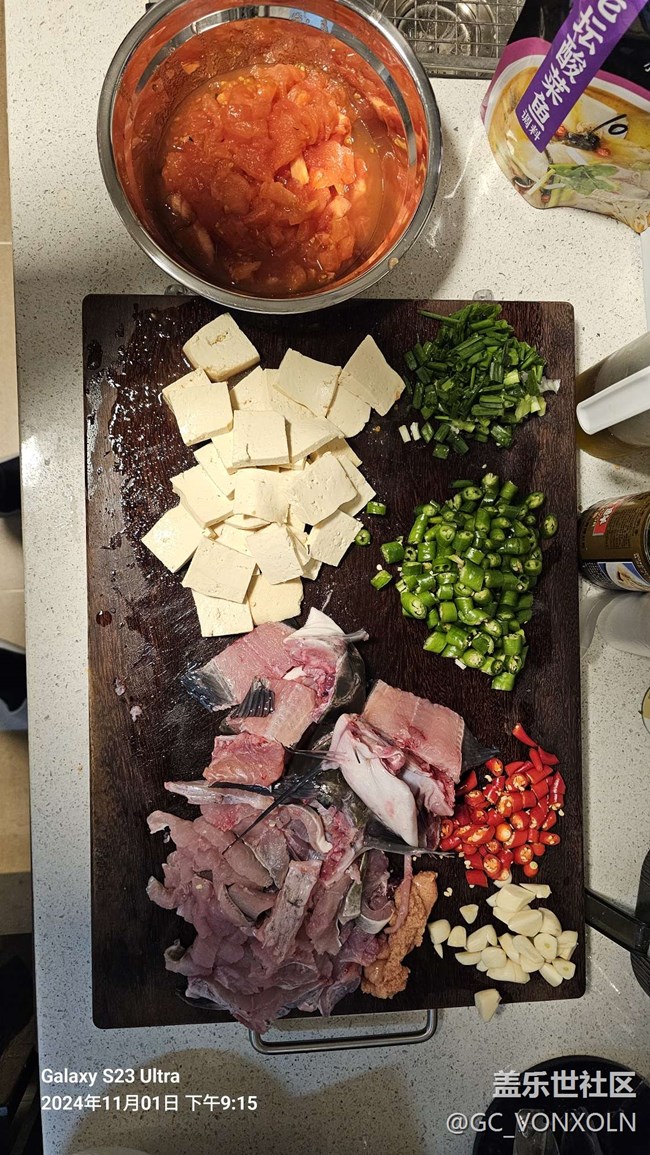 1、準(zhǔn)備好食材,梭邊魚、西紅柿、豆腐、小米椒、線椒、蒜等