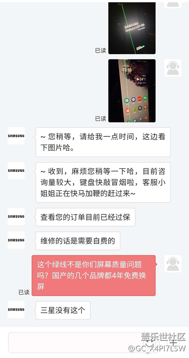 屏幕突然出現(xiàn)綠線,售后要自費更換,出現(xiàn)同樣問題的其它自主品牌有的就可以4年內(nèi)免費換屏,之前一直用三星,三星真讓人心寒。