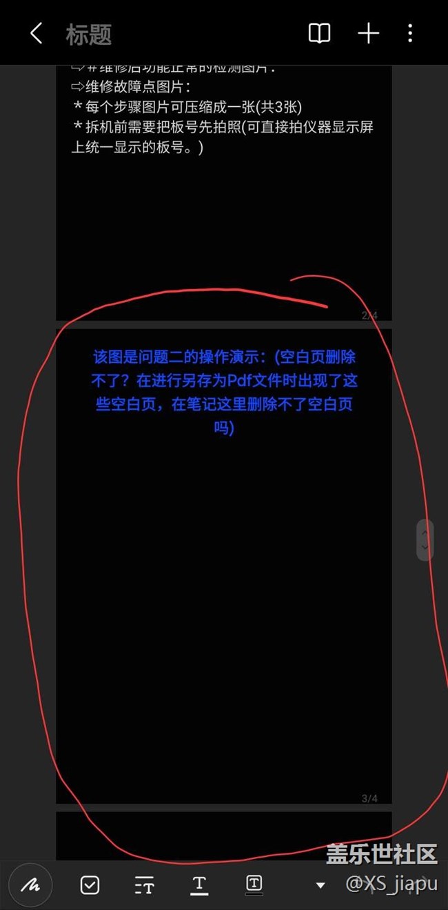 問題二:就是這個(gè)三星筆記應(yīng)用程序在編輯筆記時(shí)手滑往下拉動(dòng)剪輯界面時(shí)所新獲取到的新頁面用戶是刪除不了那些空白的頁面的?導(dǎo)致用戶進(jìn)行另存為PDF文件導(dǎo)出時(shí)出現(xiàn)了一些不要的空白頁面、我想問問能不能解決一下就是可以在筆記應(yīng)用里面刪除空白的頁面嗎?這樣子另存為導(dǎo)出來的文件就不會(huì)有空白頁面了。