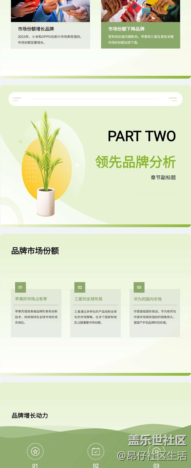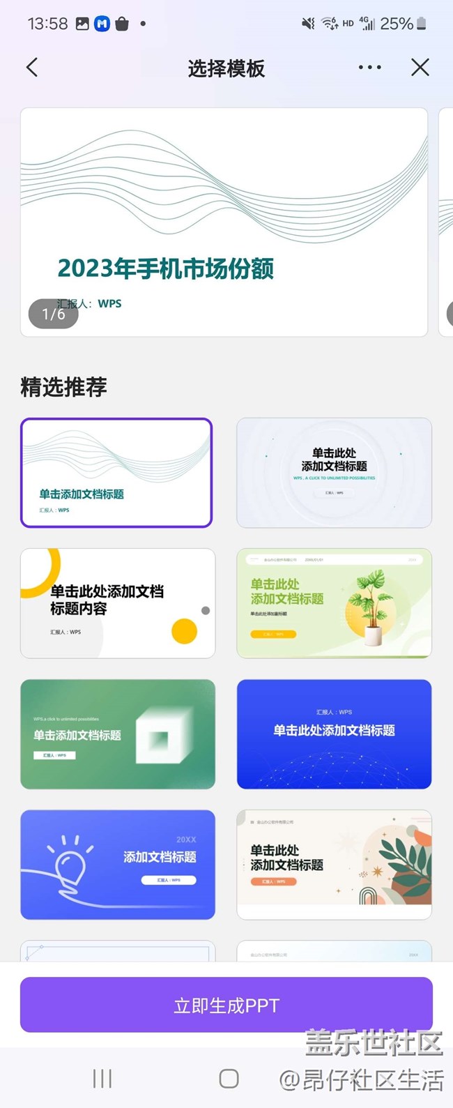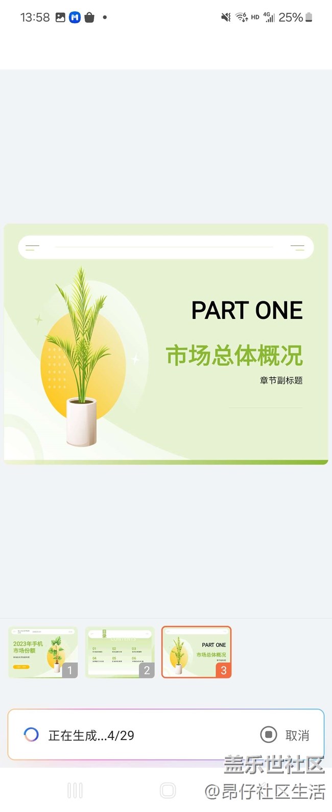 三星Galaxy Z Flip6支持的WPS AI幫寫PPT或者文稿功能真的太實(shí)用了,在三星手機(jī)中長(zhǎng)按開機(jī)鍵喚醒Bixby,通過(guò)語(yǔ)音輸入打算創(chuàng)建創(chuàng)建PPT的主題,Bixby會(huì)自動(dòng)給出具體的文案方便調(diào)整,確定后即可根據(jù)輸入的內(nèi)容智能生成PPT大綱,并根據(jù)大綱內(nèi)容挑選模板最后生成幻燈片。比如我可以生成一個(gè)手機(jī)市場(chǎng)2023年手機(jī)市場(chǎng)份額PPT,完成度相當(dāng)高。