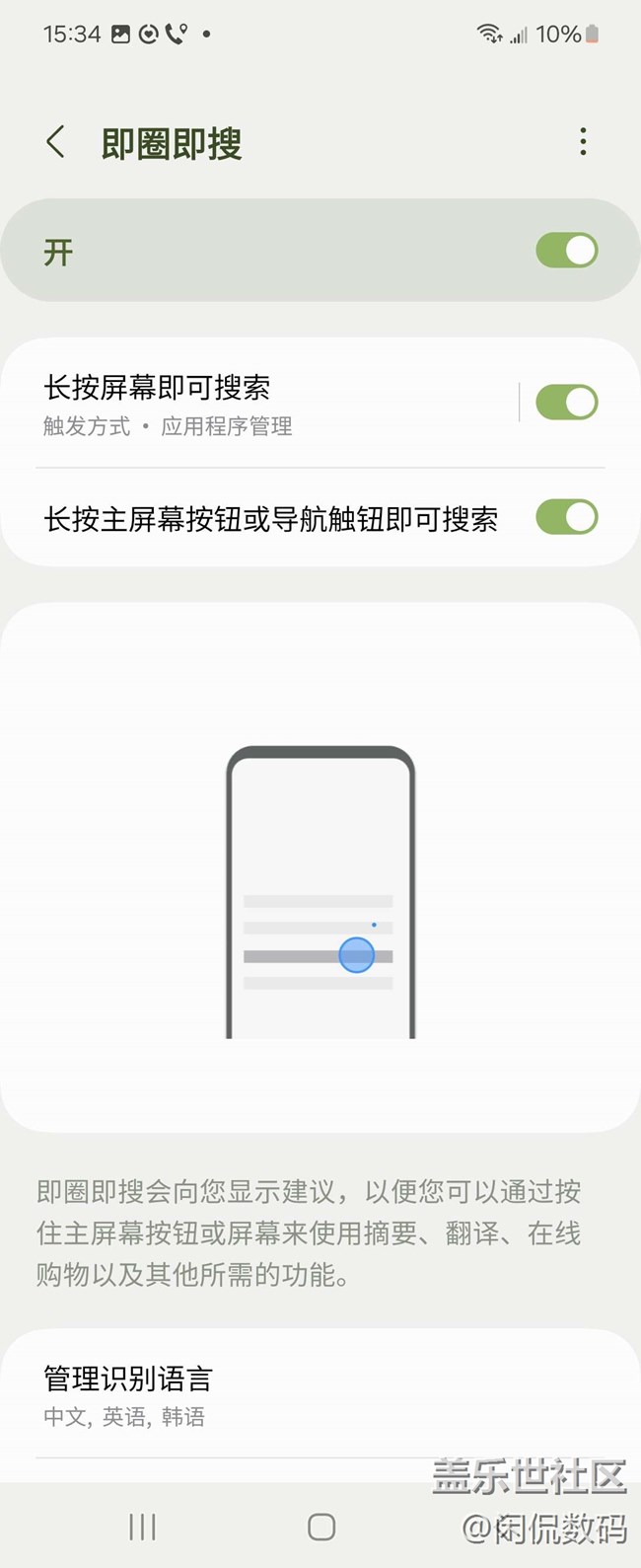 在設置中搜索即圈即搜,即可開啟。開啟后在任意照片長按主屏幕按鈕或者導航按鈕,然后圈出你要搜索的部分,它就會自動識別并檢索。
