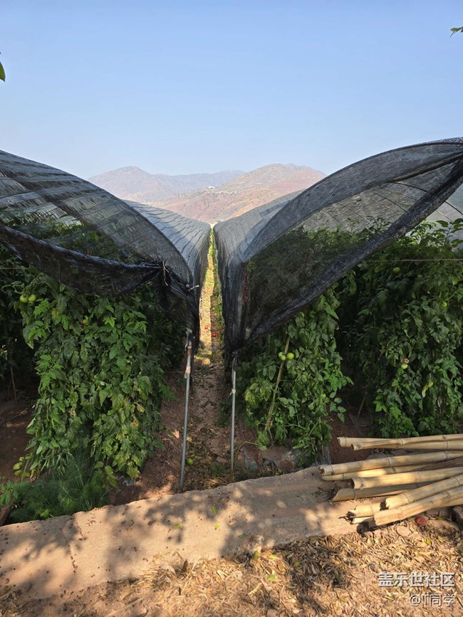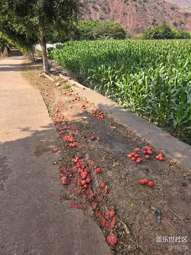 這滿地的西紅柿以及道路兩旁的種植大棚