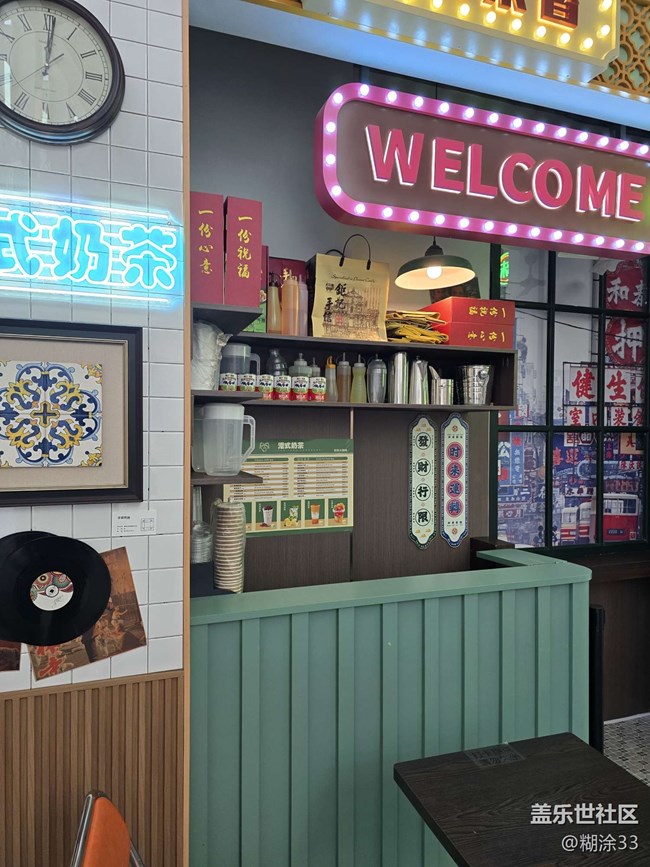 轉(zhuǎn)角邂逅復(fù)古港式奶茶店場(chǎng)景,霓虹燈牌閃爍,“WELCOME”字樣明亮耀眼,復(fù)古唱片、特色瓷磚裝飾,營(yíng)造出濃郁懷舊氛圍,讓人瞬間夢(mèng)回舊時(shí)光。
