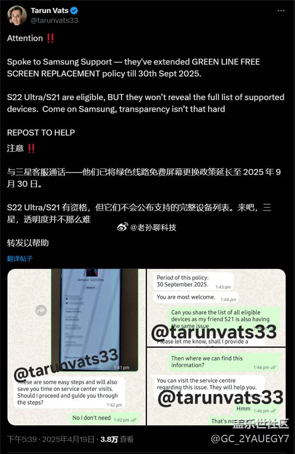 中國用戶除外,三星面向全球延長屏幕“綠線”免費(fèi)換屏!