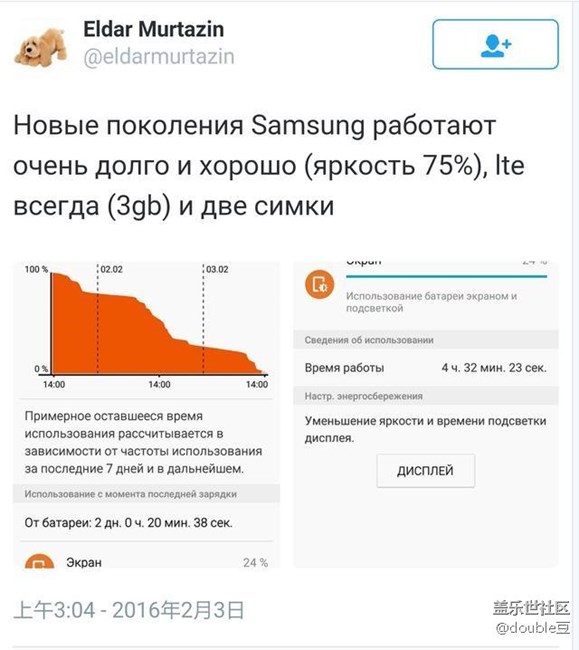 此前傳出三星Galaxy S7在屏幕最高亮度的情況下,能夠支持長達(dá)17小時的視頻播放時間的說法,但不少人為此都持懷疑態(tài)度。而現(xiàn)在,俄羅斯網(wǎng)站知名主編Eldar Murtazin則在推特上再次爆料稱,新一代三星旗艦手機(jī)續(xù)航時間很長,并且還放出了兩張有關(guān)續(xù)航測試的截圖,證實(shí)三星Galaxy S7在續(xù)航時間方面確有驚人的表現(xiàn)。