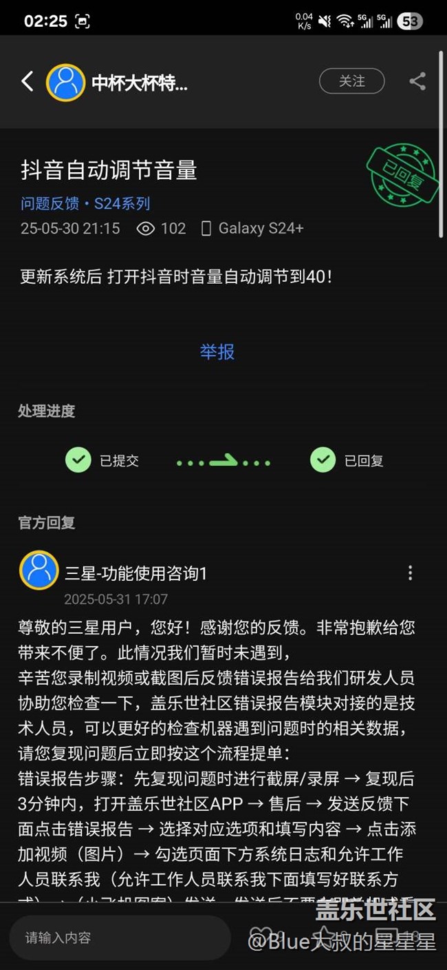 s25u在冷啟動(dòng)應(yīng)用時(shí),app音量突然增大,現(xiàn)在已在抖音、嗶哩嗶哩、小紅書、光遇等應(yīng)用多次出現(xiàn)增大情況,表現(xiàn)情況為不管媒體音量設(shè)置為10,15,還是20,打開應(yīng)用后均變?yōu)?0,現(xiàn)已排除app內(nèi)音量設(shè)置,處理措施清除緩存,重裝應(yīng)用,重置手機(jī)系統(tǒng)均無效,同時(shí)在社區(qū)內(nèi)發(fā)現(xiàn)同樣問題反饋,機(jī)型為s24+系列