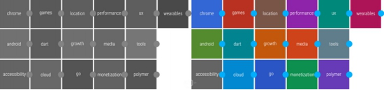而在色彩的選擇上Material design的原則是“大膽、圖形化、有意義”。在Material Design中,UI配色提倡一種主色,一種互補色。在區(qū)域較大部分的色彩采用主色的500色調(diào),區(qū)域較小的部分例如狀態(tài)欄采用深一點的色調(diào)。如此巧妙的色彩搭配使得應(yīng)用看起來非常的大膽、充滿色彩感,凸顯內(nèi)容。