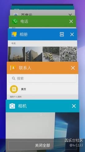 4、喚醒最近程序頁非常簡單,只需要單擊Home鍵左側(cè)的最近鍵,即可看到最近開啟的程序界面,從左往右滑動或者右往左滑動可刪除對應(yīng)任務(wù)欄,并在界面底部提供一鍵關(guān)閉所有應(yīng)用按鈕。