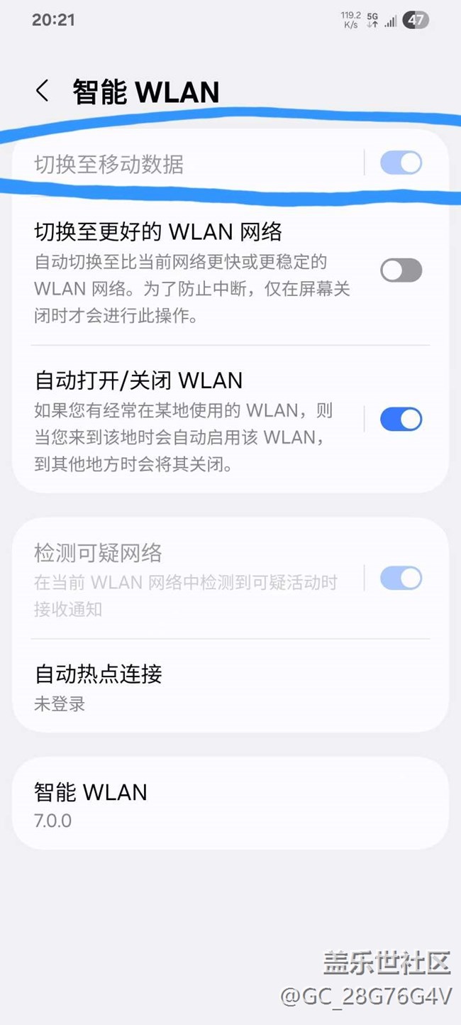 WiFi信號(hào)不好不穩(wěn)定切換移動(dòng)數(shù)據(jù)這個(gè)選項(xiàng)強(qiáng)制打開關(guān)不了 圖片