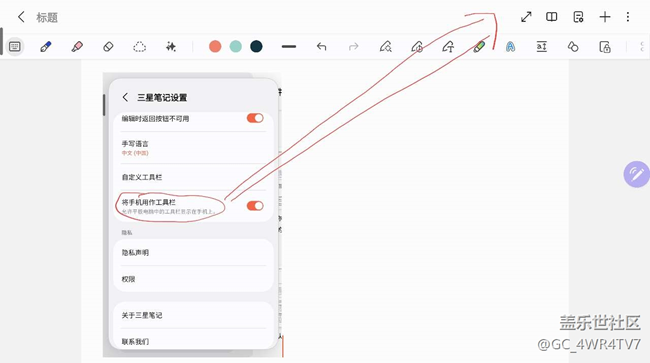 請問如何在筆記中將手機用作平板的工具欄? 圖片