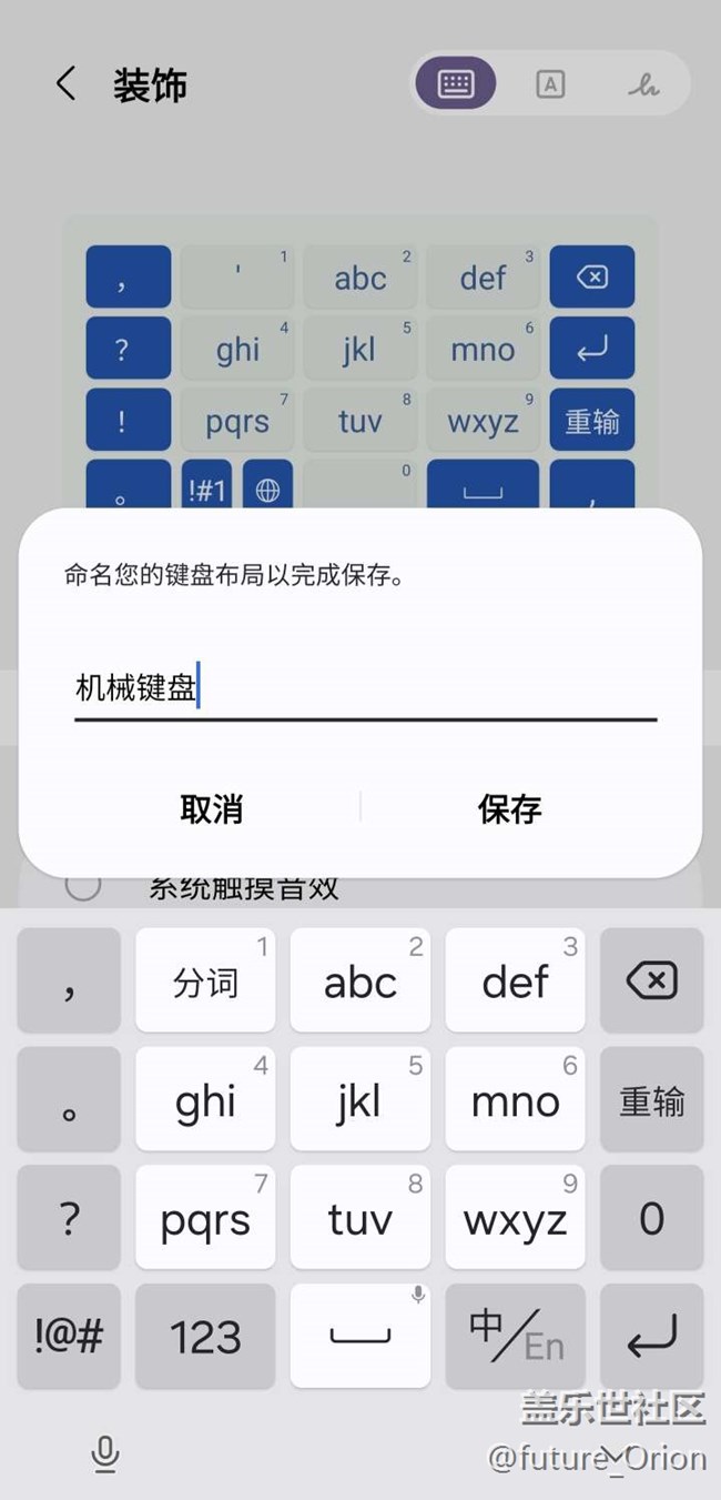 最后定制完成別急著退出,因?yàn)橐4婺銊倓偠ㄖ频姆桨?,還可以給定制的鍵盤方案起一個(gè)名稱