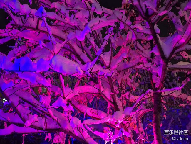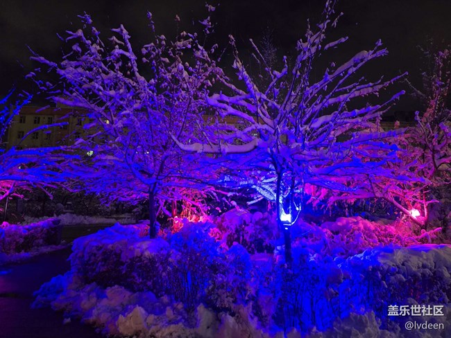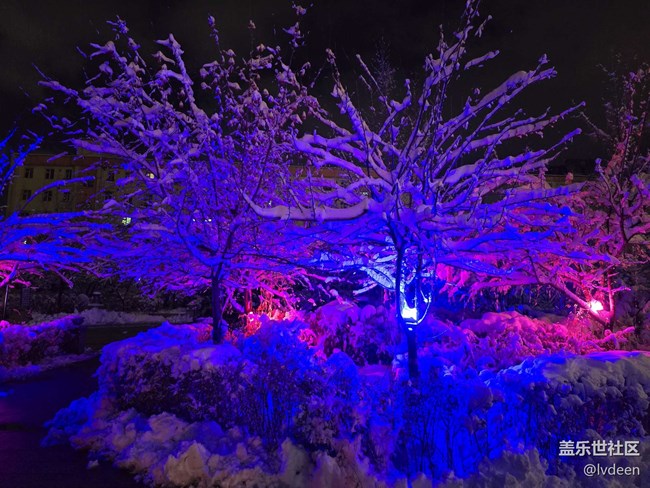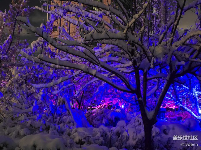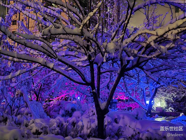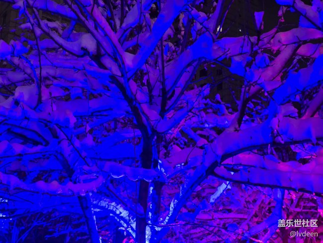 晚上小區(qū)把的燈光把雪映照有些神秘