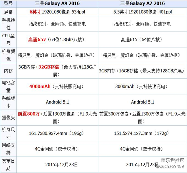 從性能對比可以看出,三星A9 2016版相比A7性能有很大的提升,該機定位高端性能。