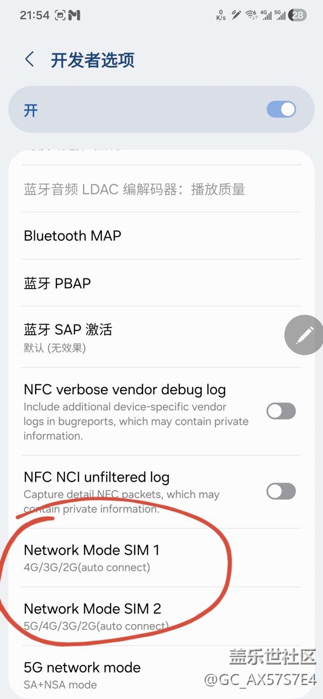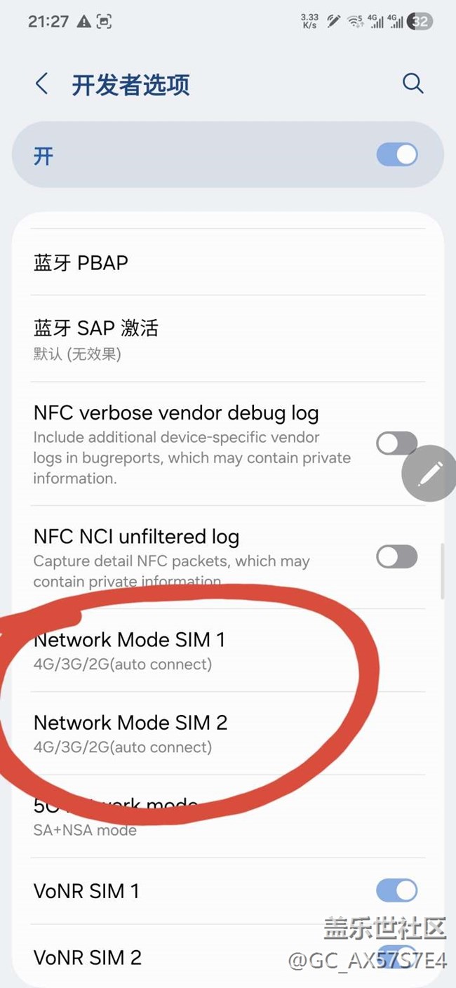 1.回老家農(nóng)村過年期間,打游戲使用的兩張電話卡網(wǎng)速都很差,網(wǎng)上說開發(fā)者模式關(guān)了5g后使用4g,網(wǎng)速會(huì)好一點(diǎn)。兩張卡我都關(guān)了5g,設(shè)置圖1。