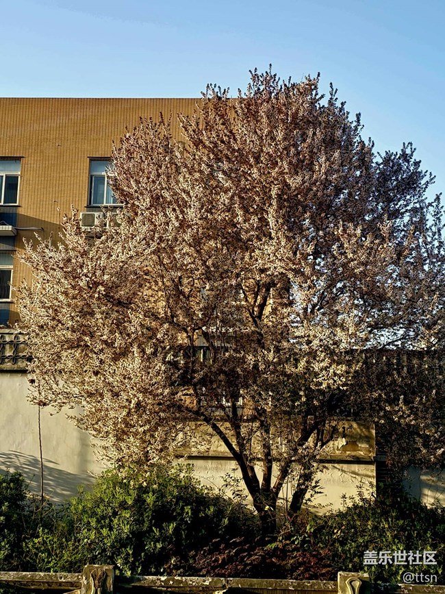 對面有一堵墻,墻前面有一棵樹,樹上有很多花,照映在陽光下