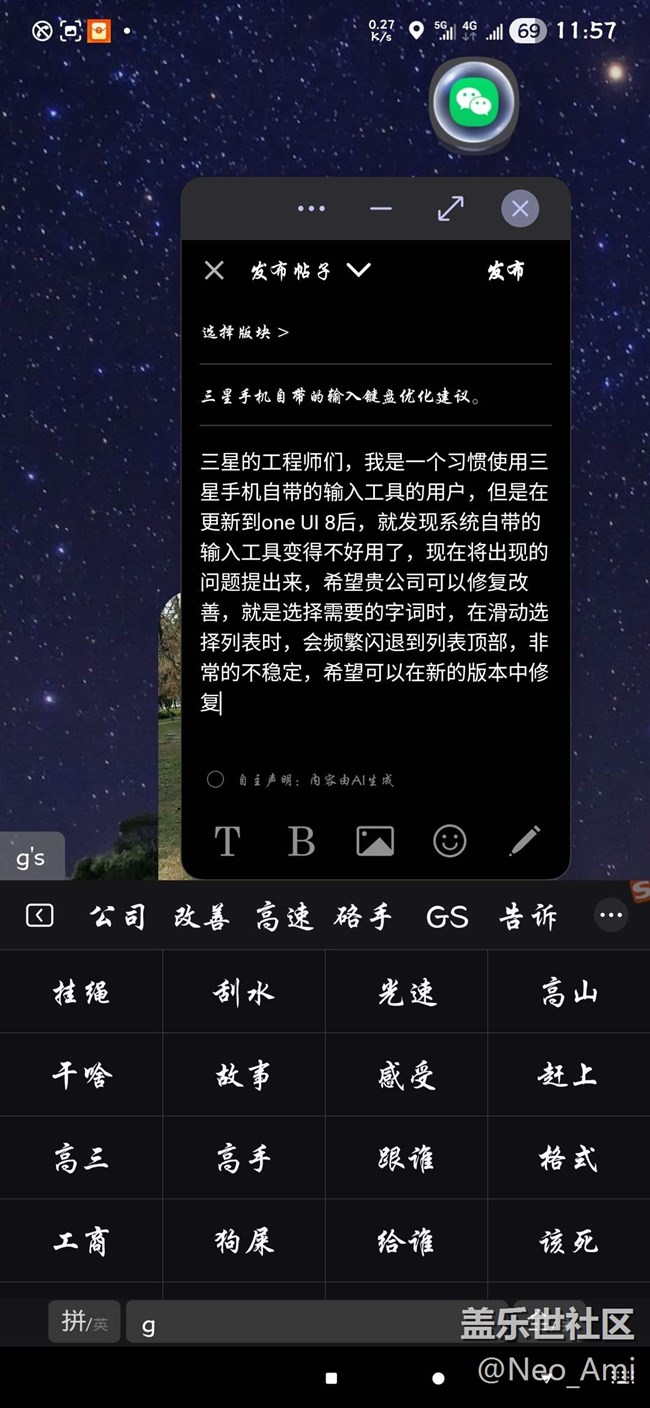 三星的工程師們,我是一個(gè)習(xí)慣使用三星手機(jī)自帶的輸入工具的用戶,但是在更新到one UI 8后,就發(fā)現(xiàn)系統(tǒng)自帶的輸入工具變得不好用了,現(xiàn)在將出現(xiàn)的問題提出來,希望貴公司可以修復(fù)改善,就是選擇需要的字詞時(shí),在滑動(dòng)選擇列表時(shí),會(huì)頻繁閃退到列表頂部,非常的不穩(wěn)定,希望可以在新的版本中修復(fù)改善一下吧。