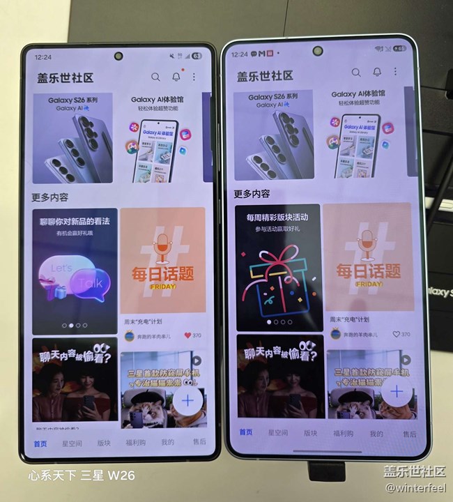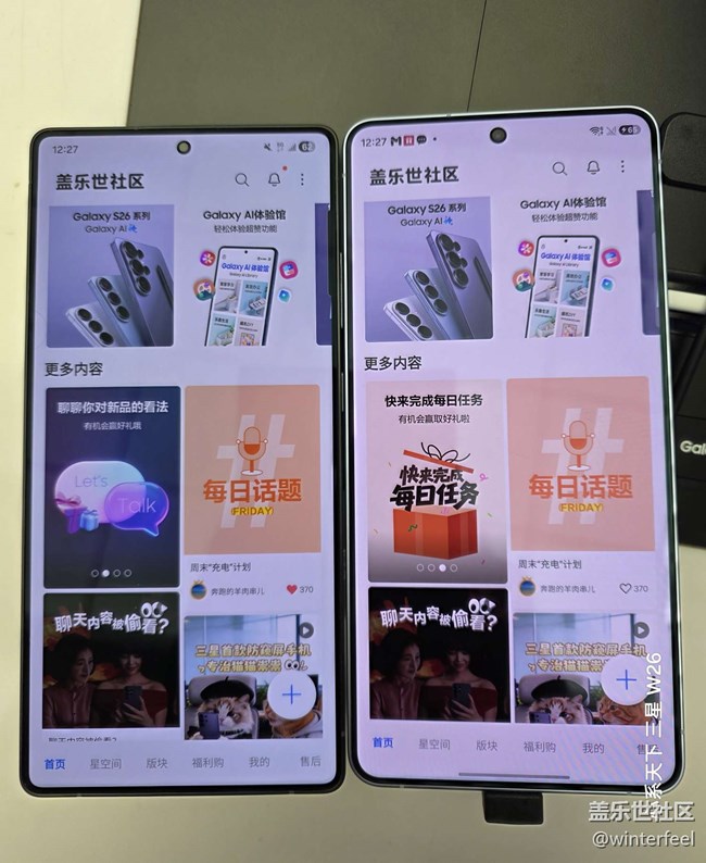 今天沒(méi)事,去三星線下店看了看S26U。主打功能防窺屏開(kāi)啟后效果不錯(cuò),手機(jī)稍微偏轉(zhuǎn)一點(diǎn)就看不清屏幕內(nèi)容了。邊框四角比25U更圓,這樣的話盡管兩款手機(jī)屏幕直角數(shù)據(jù)都是6.9,但26U的圓角數(shù)據(jù)變成了6.7(25U是6.8),最直觀的感覺(jué)就是26U的屏幕顯示區(qū)域顯得寬一點(diǎn),黑邊窄一點(diǎn)。拿在手里,輕了4克的重量不明顯,但握持感比25U圓潤(rùn)。屏幕顯示效果區(qū)別不大,設(shè)置方式一樣的情況下,26U看起來(lái)稍微亮一點(diǎn)。左邊是我現(xiàn)在用的25U右邊是26U展示機(jī)。