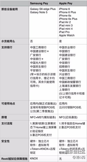 最后用一張表格來對比Samsung Pay和Apple Pay的區(qū)別