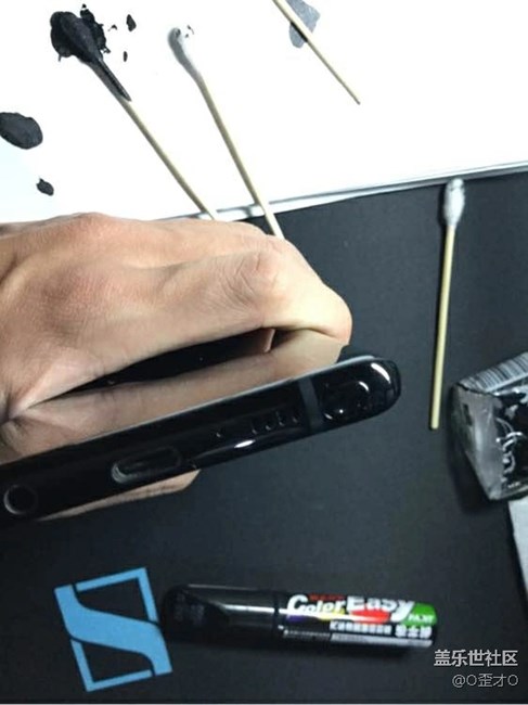 再來說說掉漆問題吧,上上個手機是note3,邊框掉漆嚴重,所以這個手機格外小心(目前未貼前膜,至今為止息屏對著光看屏幕上無任何劃痕),但是不知道為什么spen邊上迷之掉漆(下附圖),很小一塊,漏出了里面銀白色的金屬,由于我的手機是黑色的,看著很明顯,很有點傷,最后沒辦法只能自己搞了瓶補漆筆,自己補了,但是痕跡還是有,只是一眼看不出來(附補漆后的圖),目前也就這樣了,別的位置暫時沒有掉漆的情況。