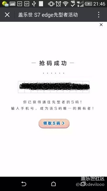昨晚10點(diǎn)多沒(méi)死心,看到社區(qū)很多小伙伴說(shuō)8點(diǎn)有搶到的,抱著試試的心態(tài)又刷了一次,顯示搶碼成功,但是輸入n遍號(hào)碼依然無(wú)果,估計(jì)試了得有10幾次吧,再次刷碼的時(shí)候直接就跳入了*的狀態(tài),此碼已兌換完畢,就是想告訴大家真正的s碼是何種形式噠,剛才又在官網(wǎng)刷了一次,還是顯示已成功,沒(méi)有搶到的小伙伴們可以再去試試,希望大家可以抽中哦~~~~
