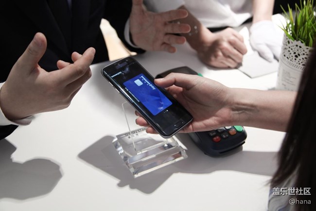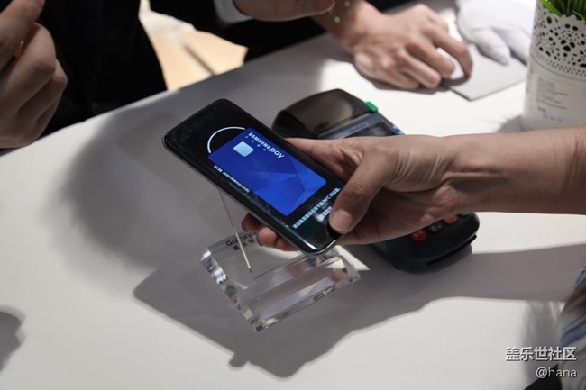 這時候一個妹子拿起了展臺上的蓋樂世 S7,打算體驗一把三星智付,在工作人員的指引下,他從息屏界面上滑屏幕,直接出現(xiàn)了三星智付中的銀行卡界面!