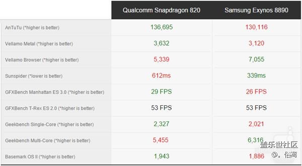 從上面的對比我們可以看到,單純從9項測試來講,驍龍820贏了5項,1項打平,Exynos 8890贏了3項。而在比較常見的安兔兔跑分和GFXBench GPU測試中,驍龍820多能取得領先,然后Exynos 8890在瀏覽器測試上體現(xiàn)出優(yōu)勢,說明ARM公版編譯器還是更加穩(wěn)定、兼容性好。從另外一個方面來解釋的話,驍龍820是四核,Exynos 8890是八核,所以多核測試,前者也不占優(yōu)。