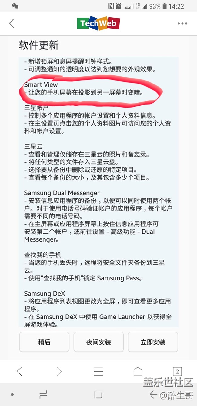 手機(jī)之前是Android7.0,用smart view對(duì)電視投屏很方便,后來升級(jí)8.0的時(shí)候看升級(jí)日志里里面有針對(duì)smart view功能上的優(yōu)化(手機(jī)投到另一屏?xí)r手機(jī)屏幕變暗),所以就升級(jí)了??墒钦l知道升級(jí)完之后直接廢了,手機(jī)上通過smart view 可以看到電視的選項(xiàng),但連接電視電視上根本一點(diǎn)反應(yīng)都沒有!手機(jī)上顯示讓拔了電視電源再試試,試了N次也不行。后來拿Android7.0的S8試了一下,smart view對(duì)電視投屏一切正常。
