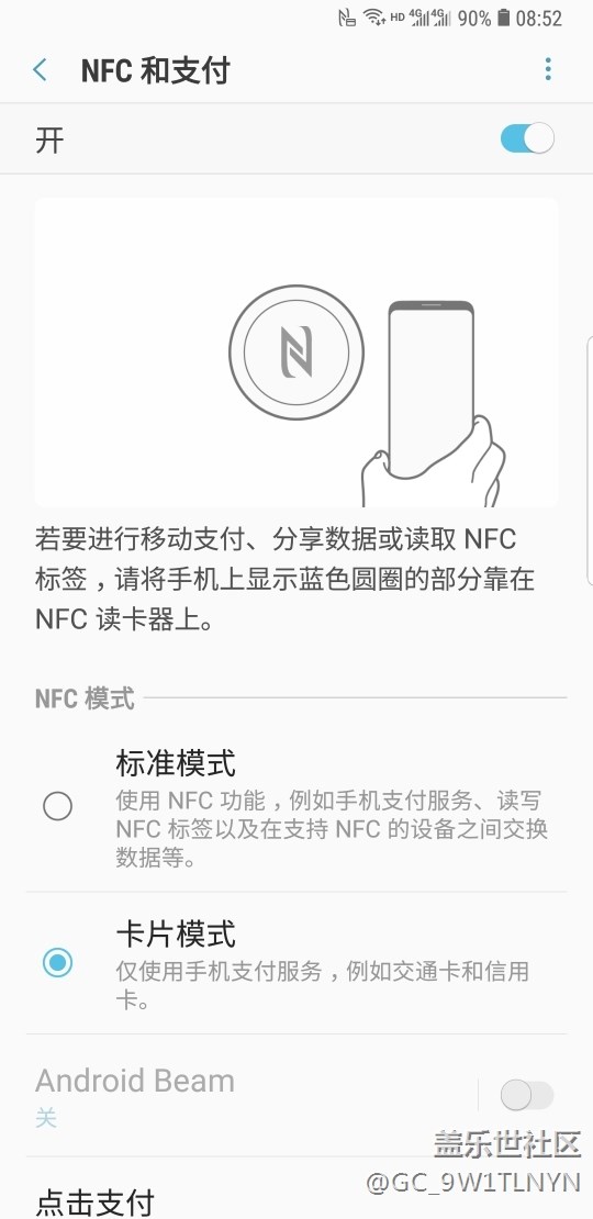 昨天用手機(jī)進(jìn)行閃付幾次沒(méi)成功,當(dāng)然手機(jī)肯定綁定銀行卡啦,不知道NFC需采用那種模式如下圖?是標(biāo)準(zhǔn)模式還是卡片模式?,謝謝