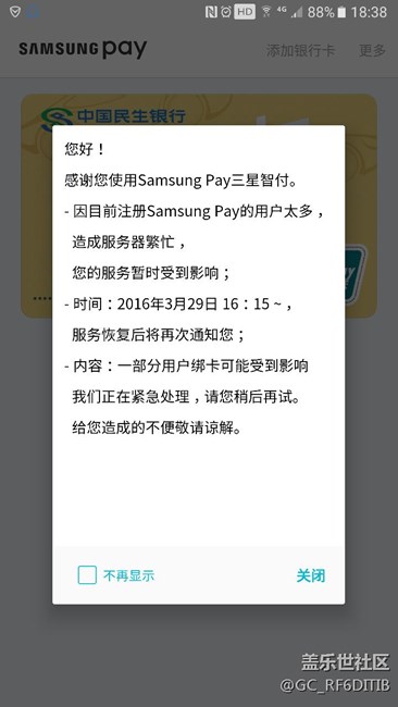 今天綁卡費(fèi)了九牛二虎之力綁上了民生的卡,光大卡無(wú)論怎樣都綁定不上,才等現(xiàn)在綁定吧,又出來(lái)個(gè)這,看圖片。三星啊,不行你別裝逼跟人家果果學(xué)啊,,,,,