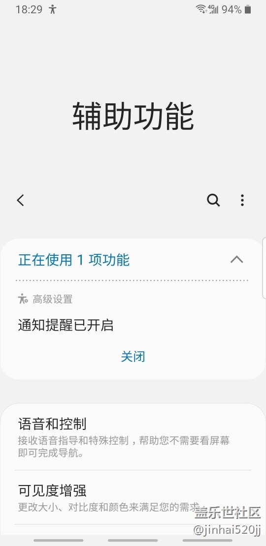 輔助功能這里就尷尬了,我開了通知提醒,然后然后狀態(tài)欄就出來個(gè)小人,一直顯示出來,除非你關(guān)掉輔助功能里的功能。顯示通知這里是灰色的,也就是無法關(guān)閉,希望下一版改正。