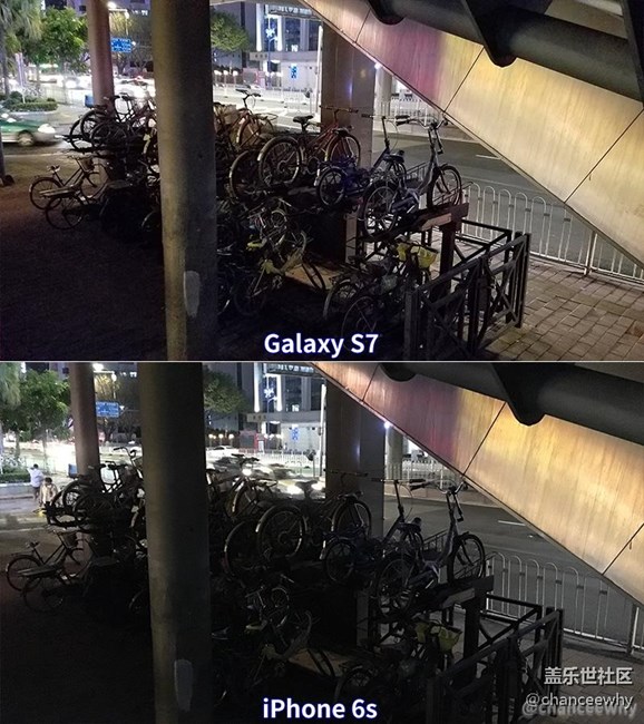 行畫質(zhì)比較,可以看到,左上(S7)圖中畫面更明亮,單車的坐墊以及周圍零部件邊緣