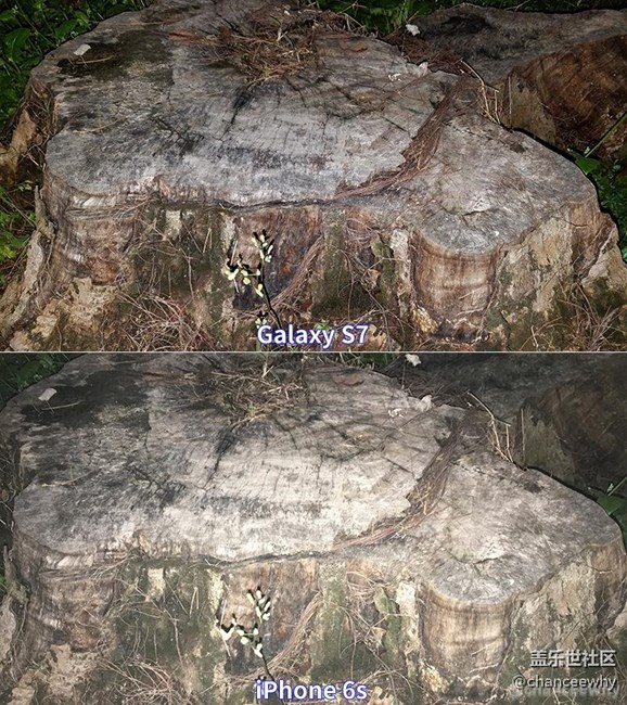 再把手機(jī)距離拉遠(yuǎn)一點(diǎn)進(jìn)行測試,6S的表現(xiàn)有點(diǎn)力不從心了。S7圖中的樹樁的紋理